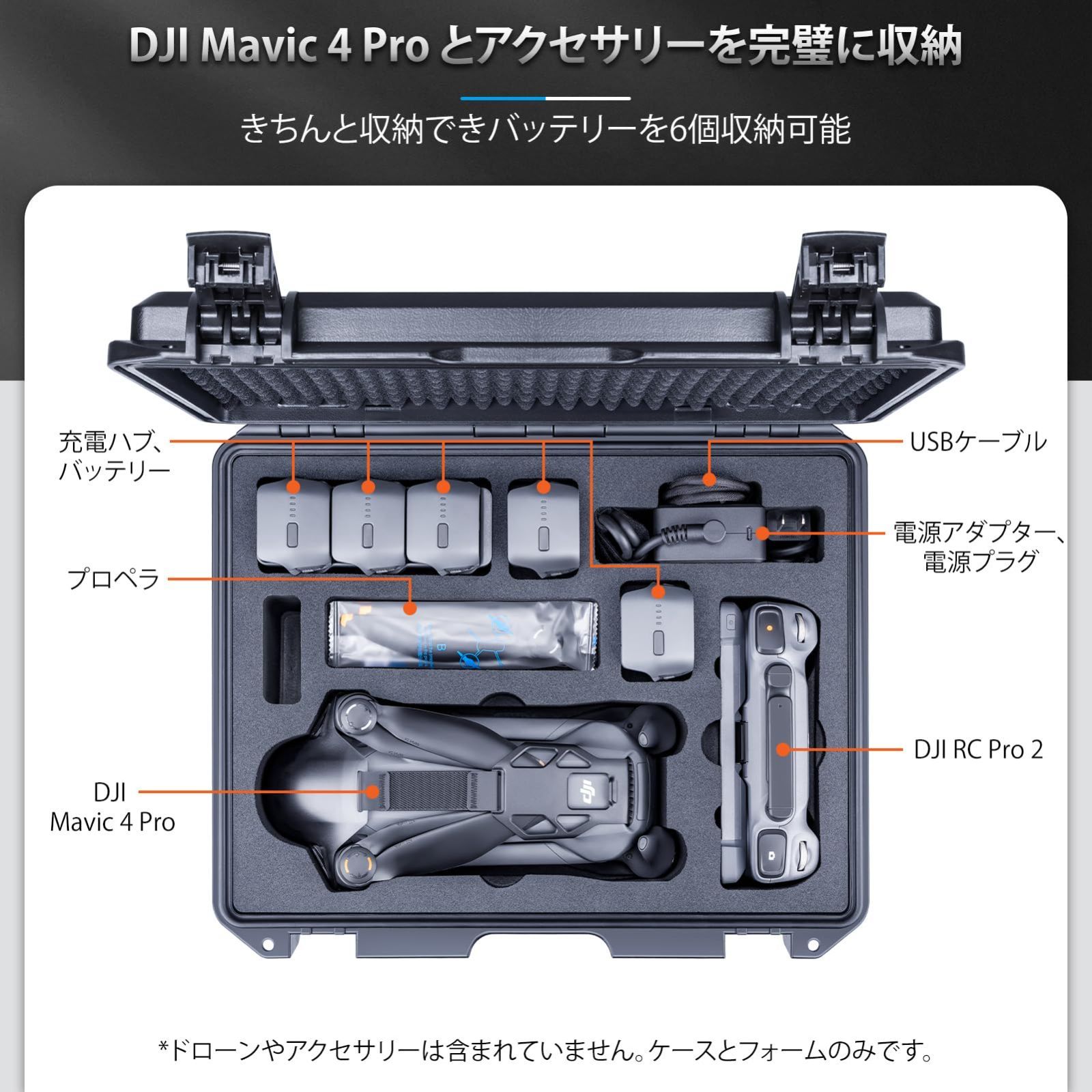 【対応機種】DJI Mavic 4 Pro 本体、最大でバッテリー6個、DJI RC Pro 2/RC2 送信機、充電器、充電ハブ、プロペラと他のアクセサリーを収納可能。