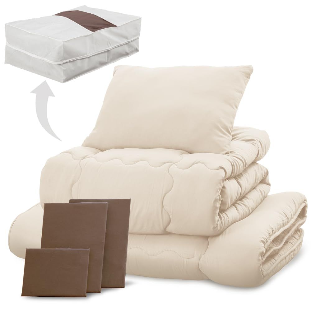 布団7点セット シングル 抗菌防臭 すっきり収納ケース付き しっとりなめらかピーチスキン加工 アイリスプラザ 掛け布団 敷布団 枕 各カバー付き ブラウン