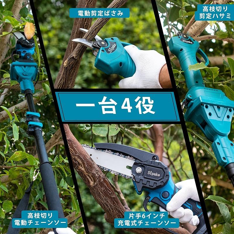 Sipake 高枝切り電動チェーンソー たかえだ 電動 チェーンソー 高枝 たかえだきりはさみ セット 一台4役 高枝切りバサミ 着脱式伸縮延長ポール 最長2 5 m 充電式 ハンディー 電動ハサミ 強力 木工切断 高枝伐採 庭木の剪定 手入れ 0