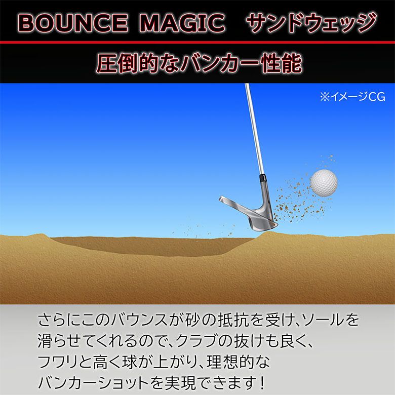 さらにこのバウンスが砂の抵抗を受け、ソールを滑らせてくれるので、 クラブの抜けも良く、フワリと高く球が上がり、理想的なバンカーショットを実現できます!