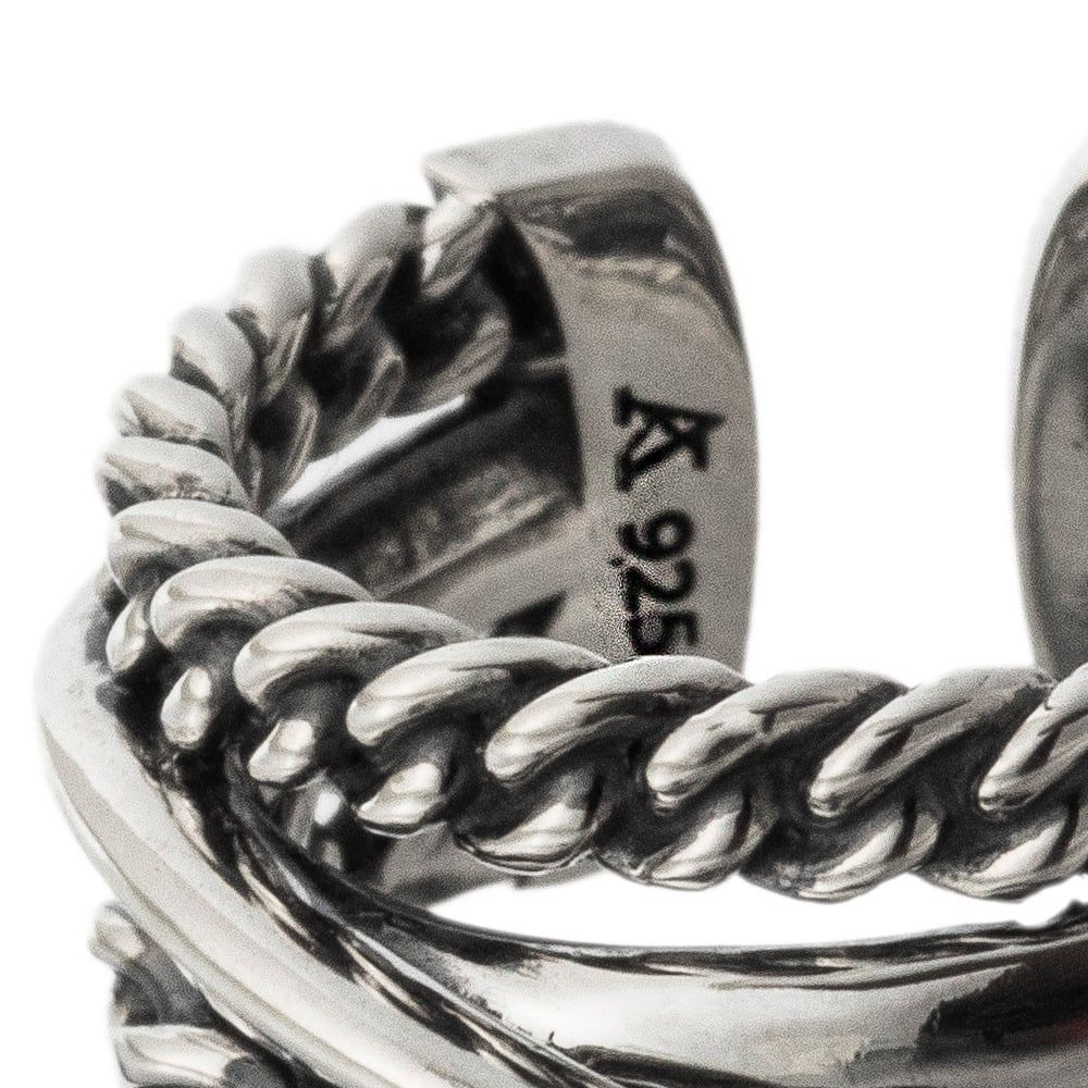 重厚感とモダンな軽やかさを兼ね備えた、存在感あるシルバーリング。喜平チェーンとコウマルリングを幾重にも重ね合わせた構築的なデザインは、力強さと洗練を同時に表現しています。チェーンの立体的な質感と、滑らかなラインを描くプレーンなアームのコントラストが、手元に奥行きのある陰影を生み、アートオブジェのような造形美を際立たせます。磨き上げられたシルバー925の光沢は、装いにラグジュアリーな輝きを添え、派手すぎず、それでいて確かな存在感を放ちます。ブランドの哲学を受け継ぐ提携アトリエ工房にて、熟練の職人が一点一点丹念に仕立てたこのリングは、ジュエリーを超えた造形美を宿した逸品。ユニセックスで楽しめるバランス感とフリーサイズ仕様により、日常から特別なシーンまで幅広く活躍します。纏う人の個性をさりげなく際立たせる、永く愛せるモダンなリングです。