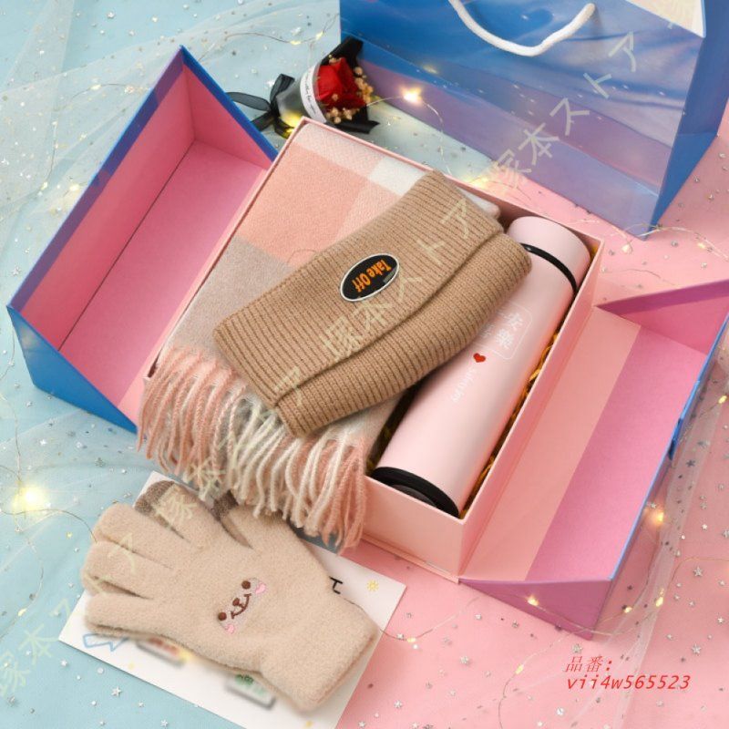 ★★カーキ2 ピンク2 グレー2 イエロー2(4セット):マフラー 手袋 帽子 保温水筒★★