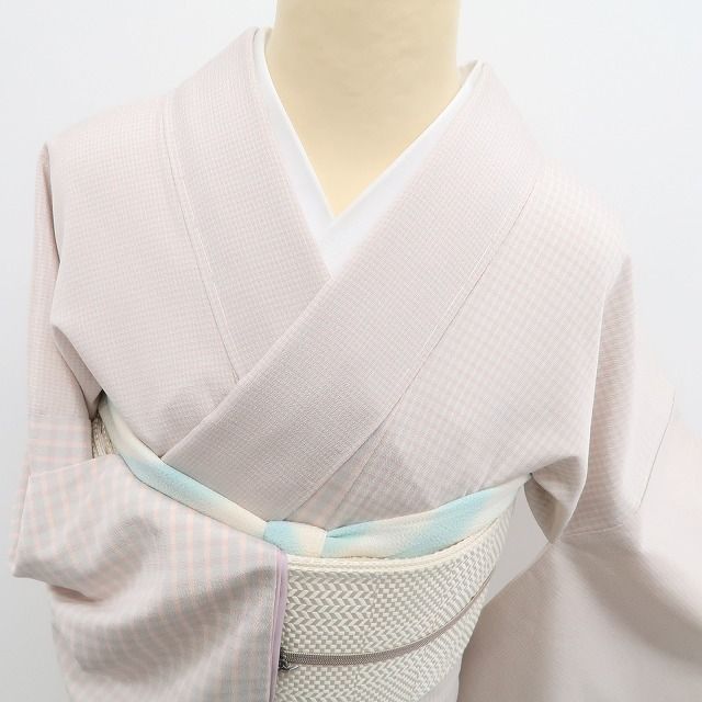 こちらのお着物は、ペールトーンの彩色でお召の美しさを引き立てるシンプルなチェック柄を和モダンに再デザイン化しています。正に創作着物の王道を行くひと品、お洒落を先取る貴女にお奨めです。