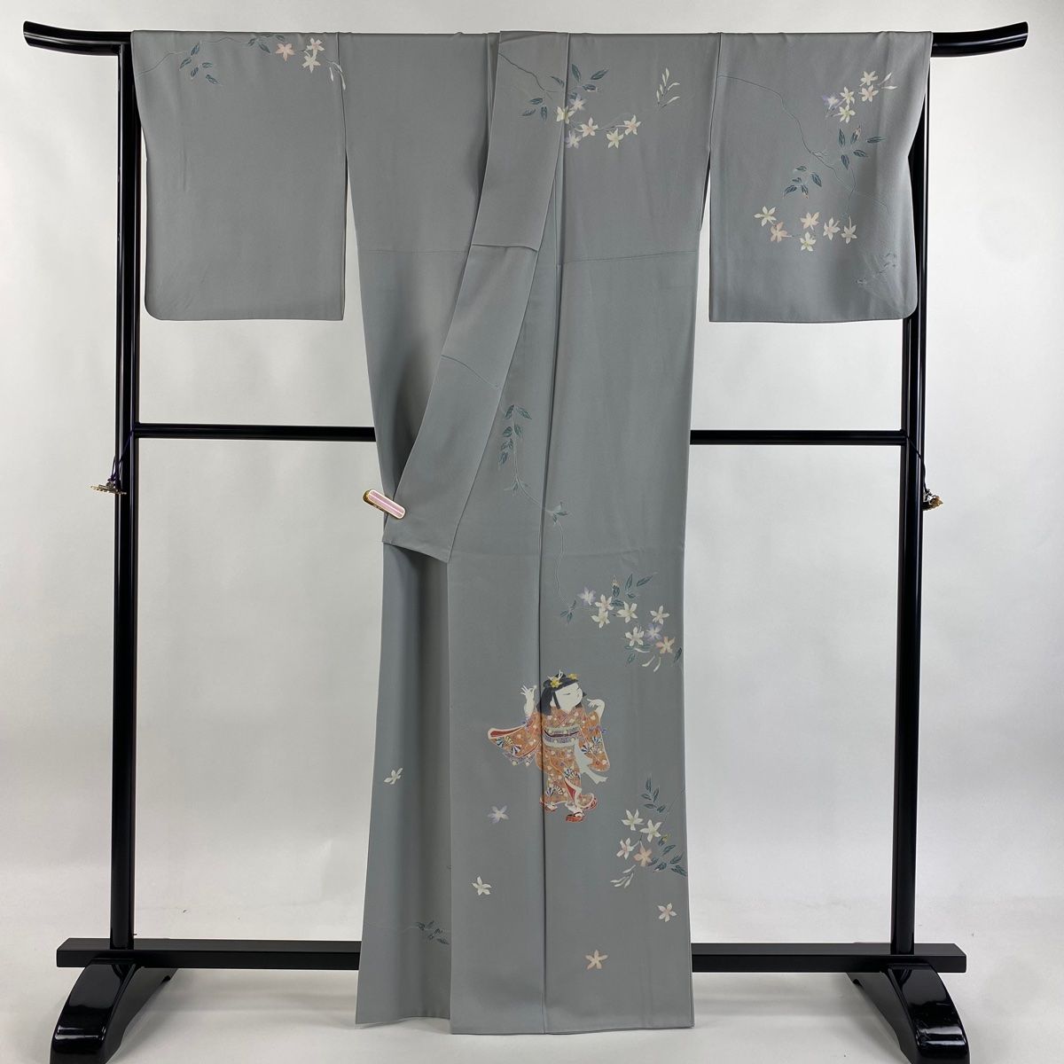 訪問着 身丈164 cm 裄丈66.5 M 袷 二代目 由水十久 落款 童 草花 青灰色 正絹