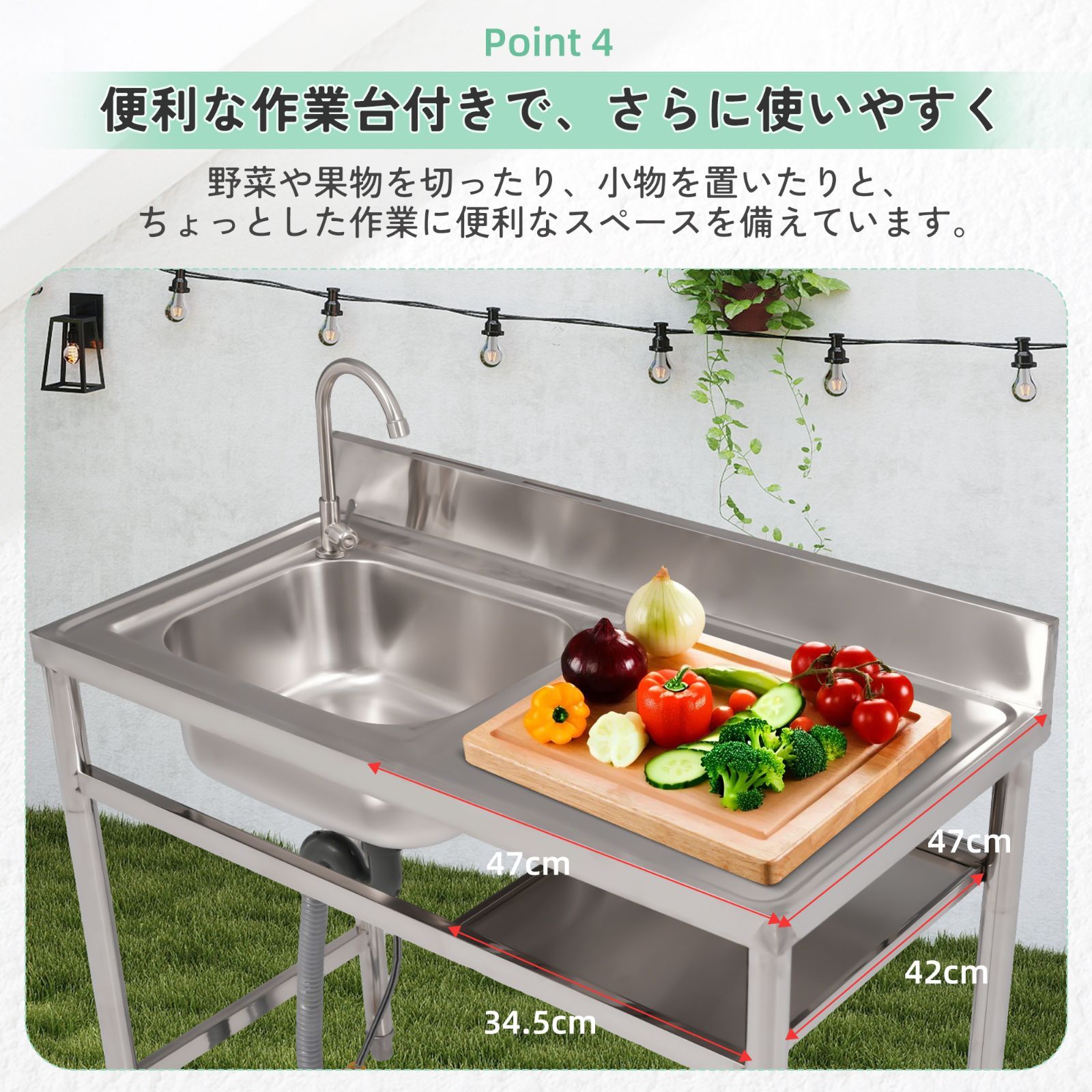 幅80 cm 屋外 流し台 ステンレス製 ガーデンシンク 作業台 キッチン 台所 簡易 シンク 組み立て簡単 収納棚付 庭 高さ調節 調理台 ガーデニング DIY 頑丈