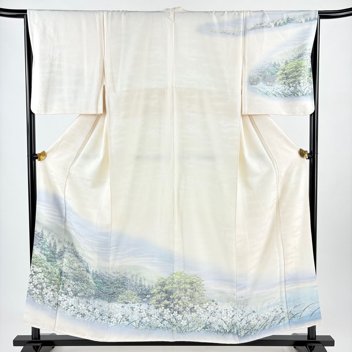 訪問着 身丈155 cm 裄丈65 M 袷 背抜き 樹木 遠山 ぼかし 銀通し クリーム 正絹 秀品
