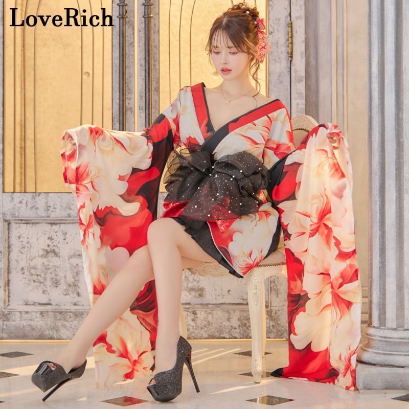LoveRich ラブリッチ ライン 2点セット シフォン 花柄 アシンメトリー プリーツスカート オフショル 豪華 帯 花魁 着物 ドレス コスプレ 1325