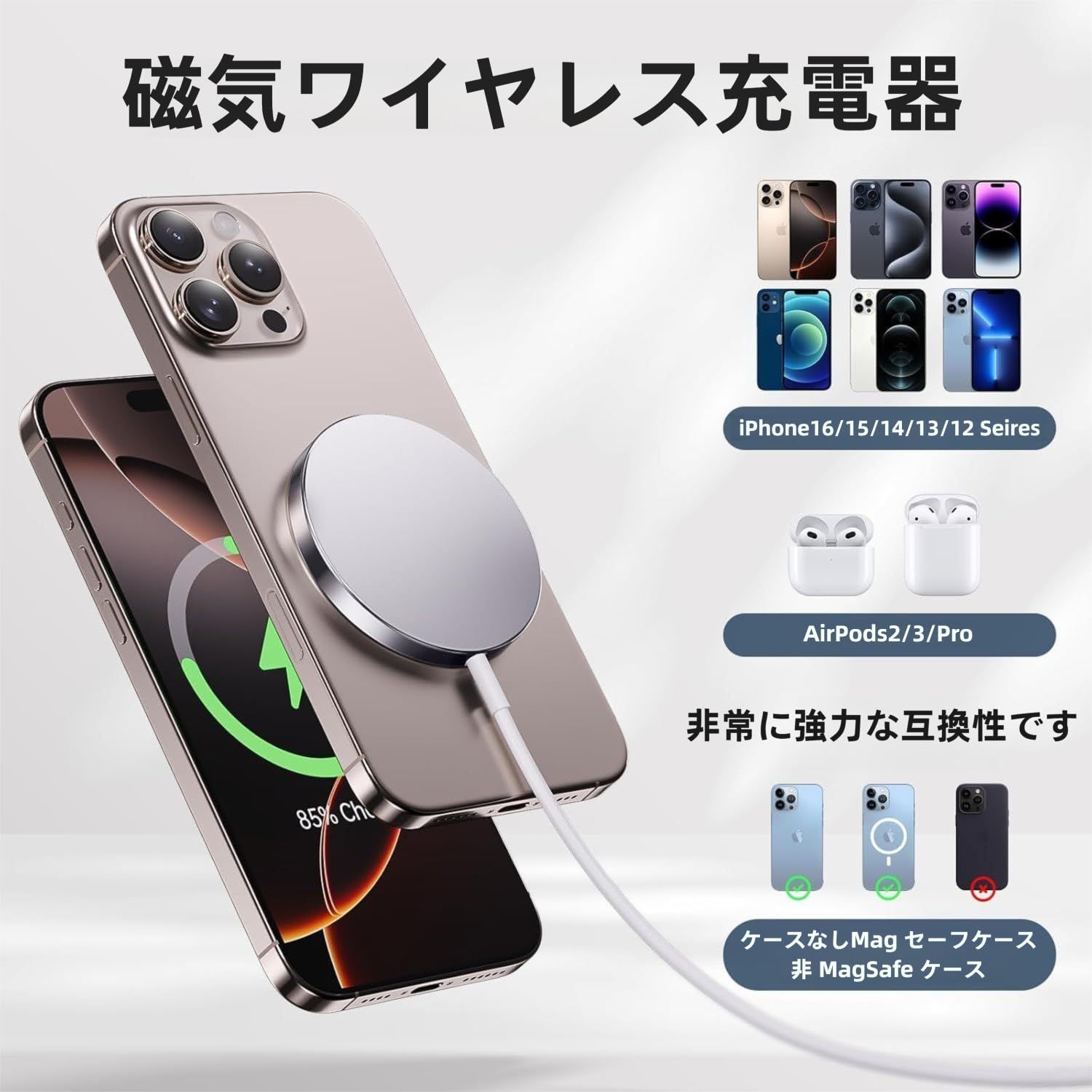 MagSafe 充電器 ワイヤレス充電器 最大15W マグネット式 超軽量 強力磁気吸着機能 マグネット コンパクト 旅行 出張 オフィスに最適 iPhone 16/15/14/13/12シリーズ、AirPods 4/3/2/pro対応