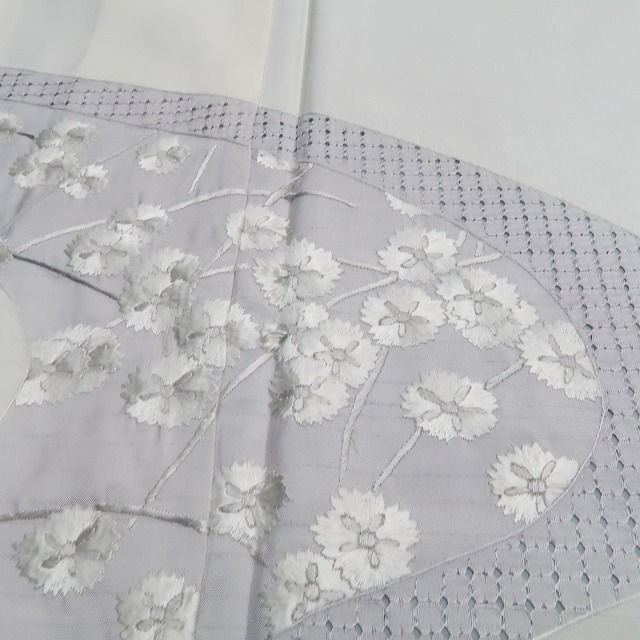 生成り色のやわらかな色調に、大島紬ならではの織りの陰影が映え、さらに撫子の総刺繍が優美なアクセントを添えています。撫子は秋の七草のひとつとして古くから愛されてきた花。