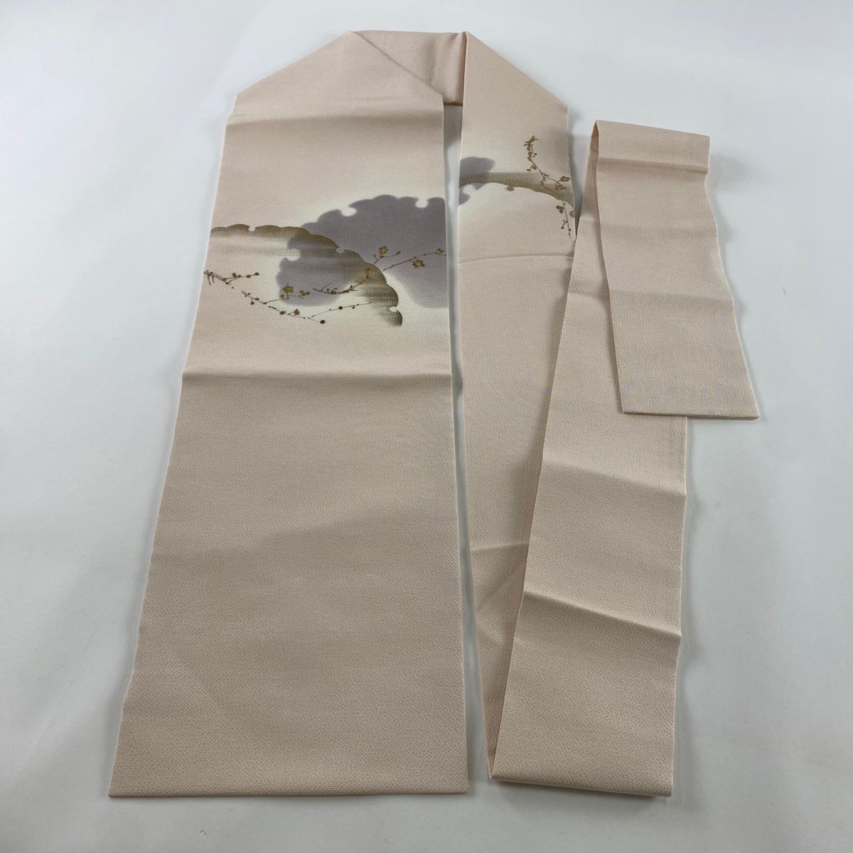 名古屋帯 秀品 雪輪 枝梅 金彩 縮緬 ピンクベージュ 正絹