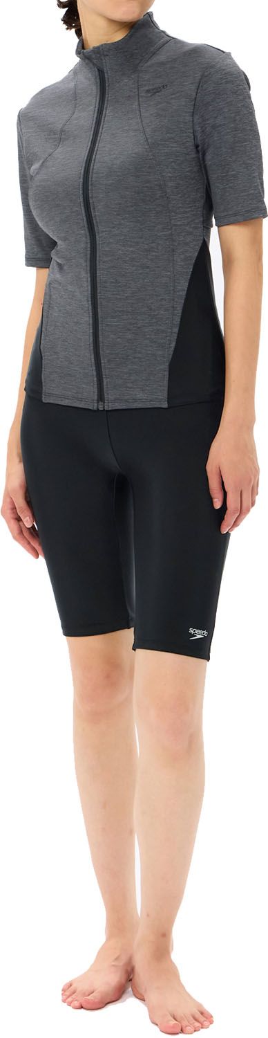 フィットネススイムウエアカテゴリー[POOLATHLETICS(プール・アスレティクス)]より、水中でのアクティビティを楽しむ方やはじめてプールでエクササイズを始める方におすすめのセパレートシリーズ。気になるパーツをスマートにカバーするレディースセパレーツ。トップスはソフトなストレッチ性とボディラインを拾いすぎないハリ感、軽量感が特徴の環境配慮型素材[HEATHERSTRETCHPRO(ヘザー・ストレッチ・プロ)]を採用。半袖タイプで気になる二の腕をカバー。フロントのウェービーライン&スタンドカラーにより、肩まわりはすっきりコンパクトな印象です。
