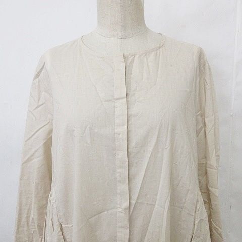 マーレット Merlette ワンピース ひざ丈 長袖 クルーネック 比翼釦開き 切替 ギャザー コットン ベージュ XS