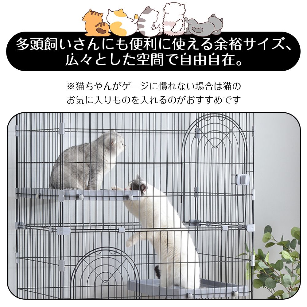 ・素材 線材:スチール(粉体塗装) ジョイント、扉ロック、トレー :ポリプロピレン ・カラー グレー、グリーン、ピンク ・商品サイズ 83×60×110cm ・梱包数 1 ・梱包サイズ 85×62×13cm ・重量(N.W.) 14.5kg ・重量(G.W.) 16kg ・生産国 中国 ・組立品/完成品 組立品 Features この商品について: ◎01一段タイプとしても使用可能 ◎02錆びにくいエポキシ樹脂塗料 ◎03広々としたスペースで窮屈しない ◎04つまみタイプのドアがいたずらにくい ◎05広い棚板でののびのびリラックス ◎06梯子付き ◎07飛び出し防止屋根付き 商品の説明: ◆ 01一段タイプとしても使用可能 子猫一匹は一段、大きくなってきたら、家族が増えたら、新しい猫ちゃんを迎えることになったら、二段に増築し、楽しくアレンジできます。 ◆ 02錆びにくいエポキシ樹脂塗料 耐食性、耐磨耗性に優れていて、末永くお使いいただけます。 ◆ 03広々としたスペースで窮屈しない 多頭飼いさんにも便利に使える余裕サイズ、広々とした空間で自由自在。 *猫ちゃんがケージに慣れない場合は猫のお気に入りものを入れるのがおすすめです。 ◆ 04つまみタイプのドアがいたずらにくい すべての段に扉がついているので、にゃんこやモノの出し入れが簡単です。 ◆ 05広い棚板でののびのびリラックス 広々とした棚板があり、猫ちゃんがのんびりリラックスできます。サイズが十分あるので、棚板に猫ベッドやおもちゃなども置ける。 ◆ 06梯子付き 上り下りしやすい梯子付属、子猫やシニア猫でも使いやすいです。 ◆ 07飛び出し防止屋根付き 屋根付きので、猫が飛び出しを防止できます。 Attention ご注意: