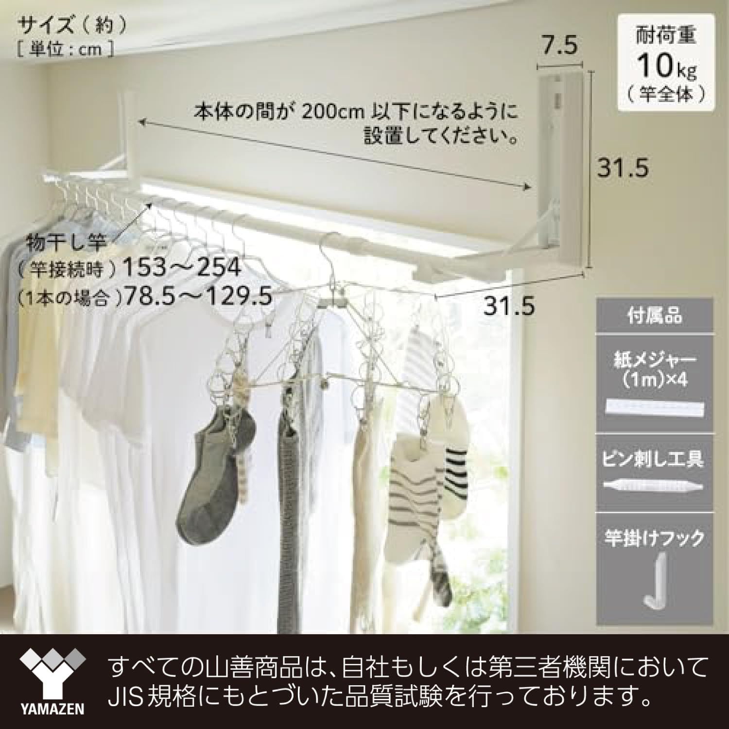 山善 室内物干し 窓枠物干し 物干し竿 室内 省スペース 洗濯物干し 伸縮 壁付け コーナーでも使える 取付け穴が目立たない 耐荷重10 kg 部屋干し 竿内寸最大2 m 窓枠 梅雨 組立品 ホワイト NPH 8025 WH