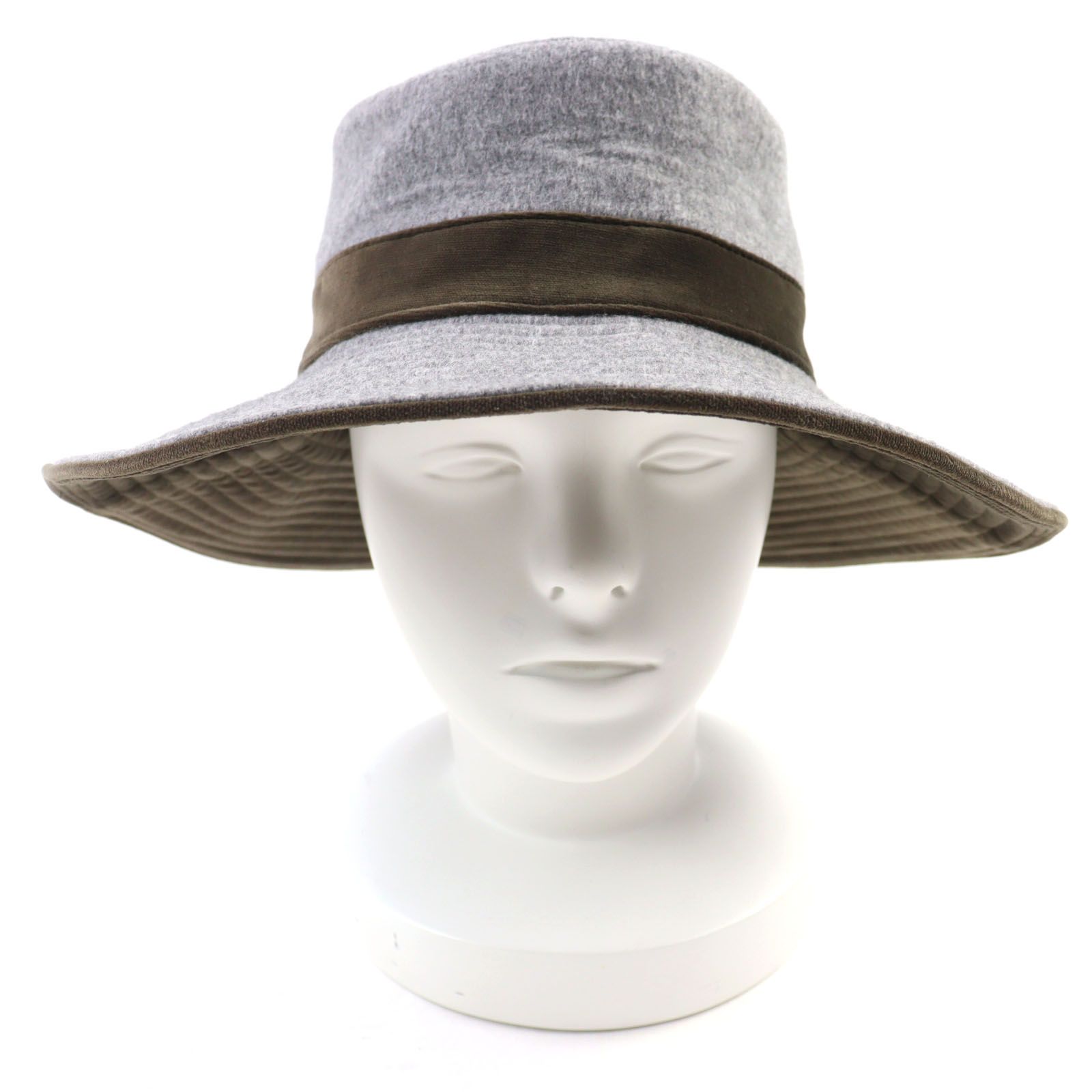 HERMES エルメス ウール カシミヤ混 裏地ロゴ総柄 ベロア切替 帽子 ハット グレー カーキ 57 フランス製 レディース