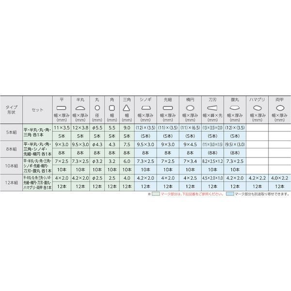 ●組ヤスリの5本組~12本組は全長を表します。5本組=215mm 8本組=200mm 10本組=185mm 12本組=170mm