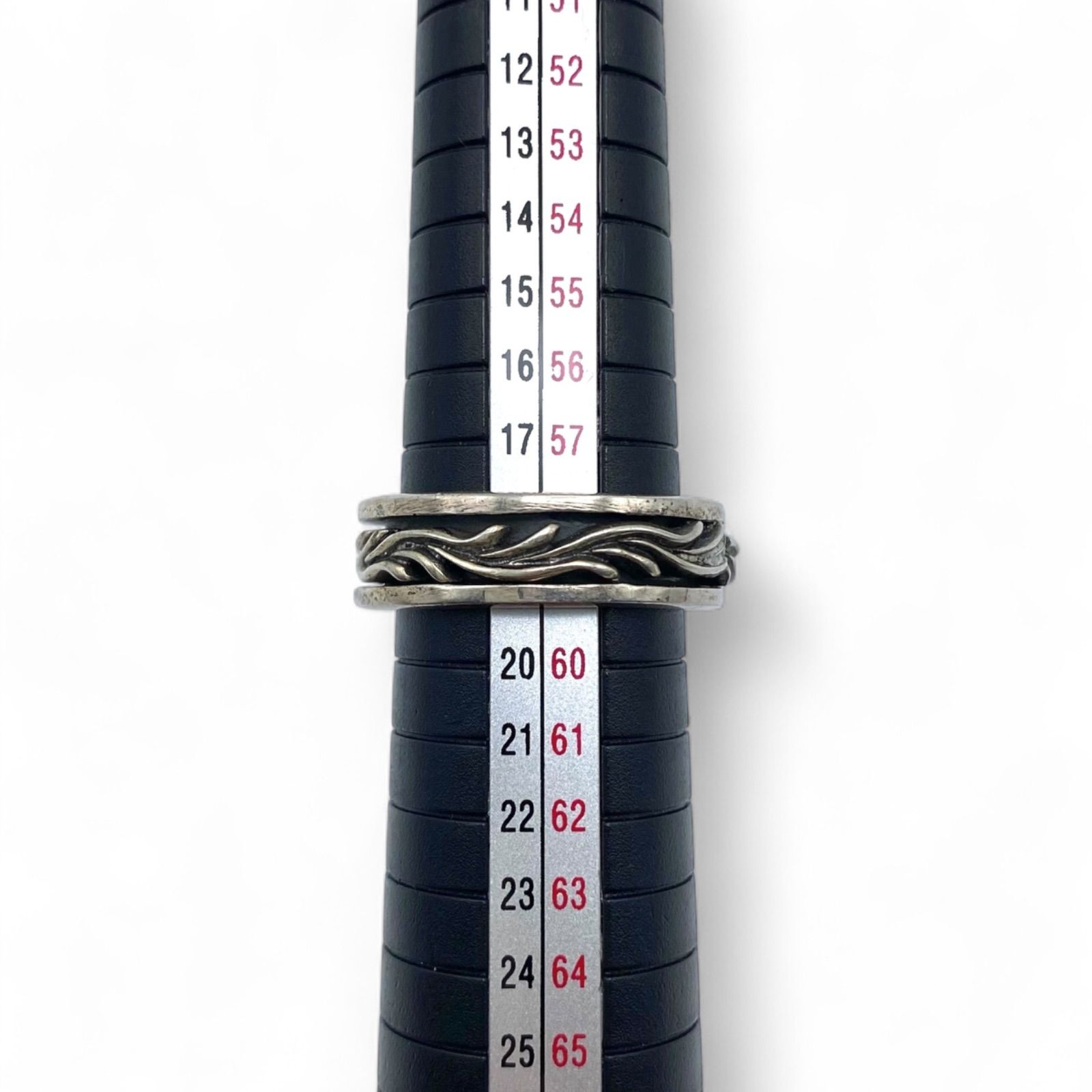 シルバー925に施された唐草模様を、燻しで立体的に仕上げたリング。深い陰影が模様を強調し、力強くも上品な雰囲気を纏います。ヴィンテージらしい重厚な味わいが魅力です。また、中央部は回転する仕様となっており、遊び心が感じられます。