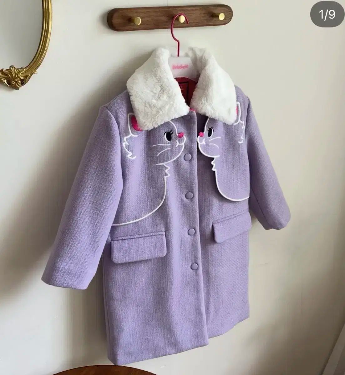 Lサイズの可愛らしいデザインのガールズコートです。かわいい猫の刺繍がポイントで、やわらかいファーの襟が暖かさをプラスしています。希少な薄紫色がとても美しいです。