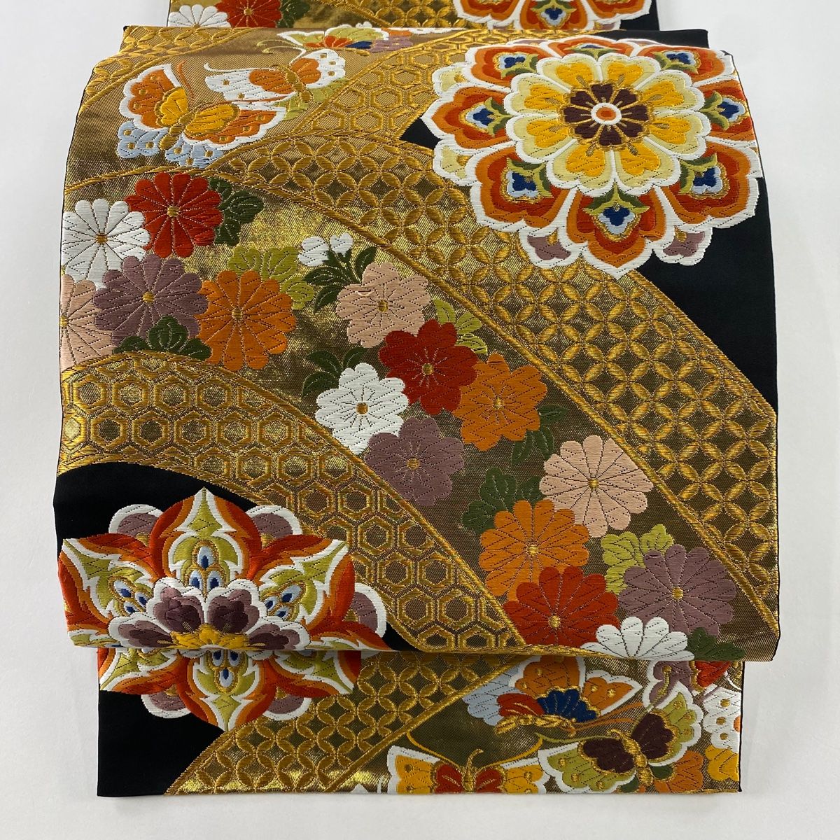 袋帯 秀品 落款 振袖向き 鈴乃屋 華文 蝶 金糸 唐織 黒 六通 正絹
