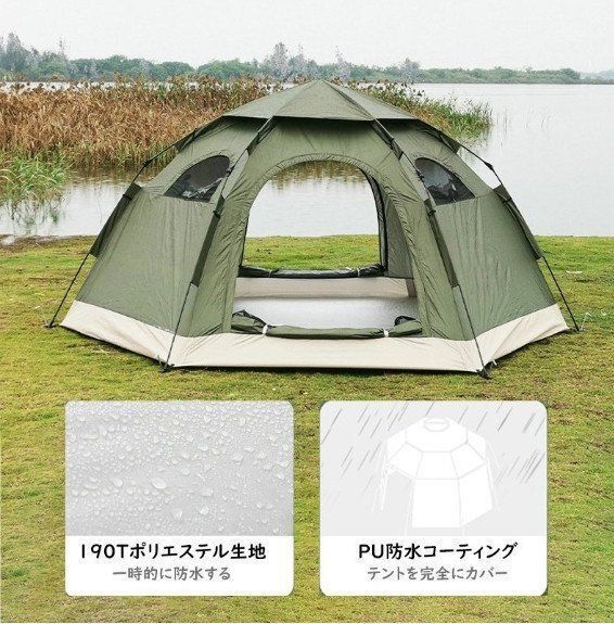 ■ 4~6人用のオフホワイトの六角形のテントです。設置が簡単で、お年寄りやお子様でも簡単に設置できます。