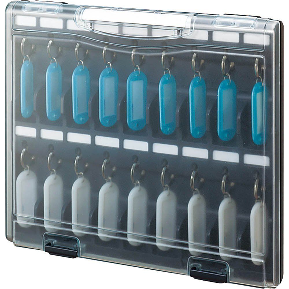 ●付属のキーホルダー型名札を18個まで収容可能。鍵はスライドするだけでロックができ、持ち運んでも脱落しません。