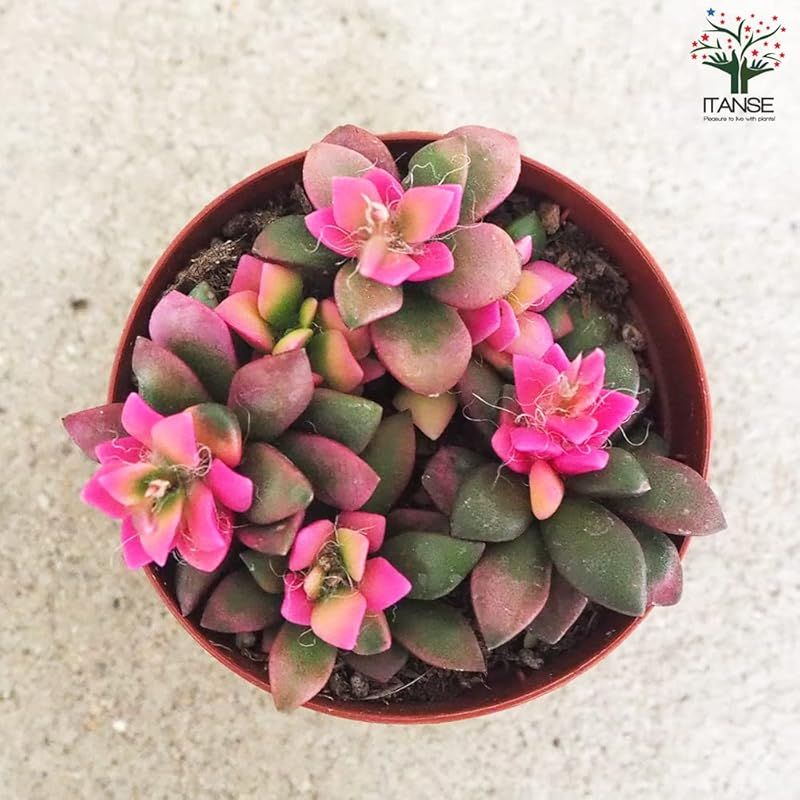 珍しい紅葉系の斑が入る品種で、冬になると鮮やかな蛍光ピンク色に紅葉します。 本来の緑葉と蛍光ピンクが絶妙に混ざりあった葉姿は美しく、まさに桜吹雪のようです。 夏になってもこのピンク色を残しつつ、グリーンの色が強くなるので、年中を通して「桜吹雪のような」葉姿が楽しめます。 美しい葉色から、寄植えの素材としても使われています。 また環境が合えば、春頃になると濃ピンク色の花も咲かせます。