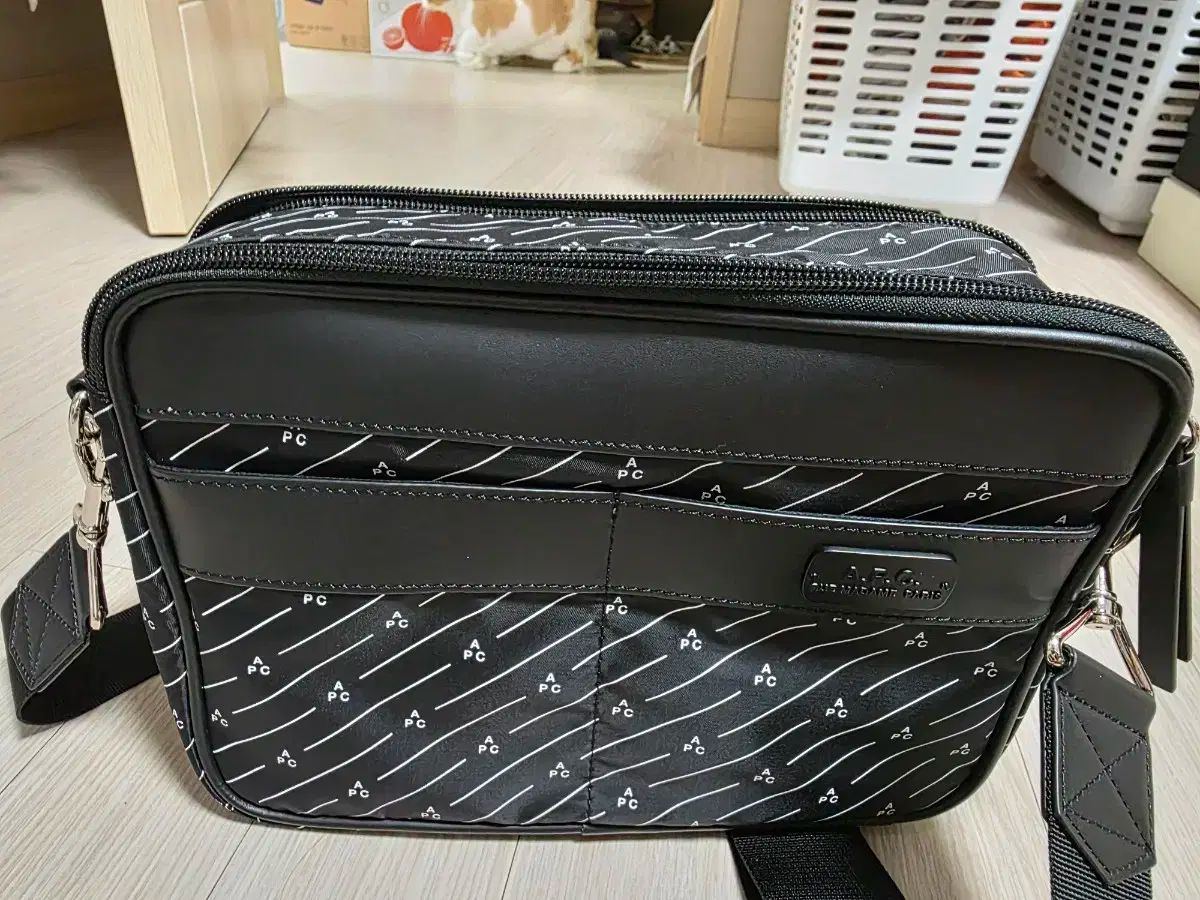 これはA.P.Cマイルズのブラックカメラバッグです。バッグストラップの長さは調節可能で、十分な収納スペースがあります。APCのロゴパターンがかすかに入っています。一度着てから保管しています。