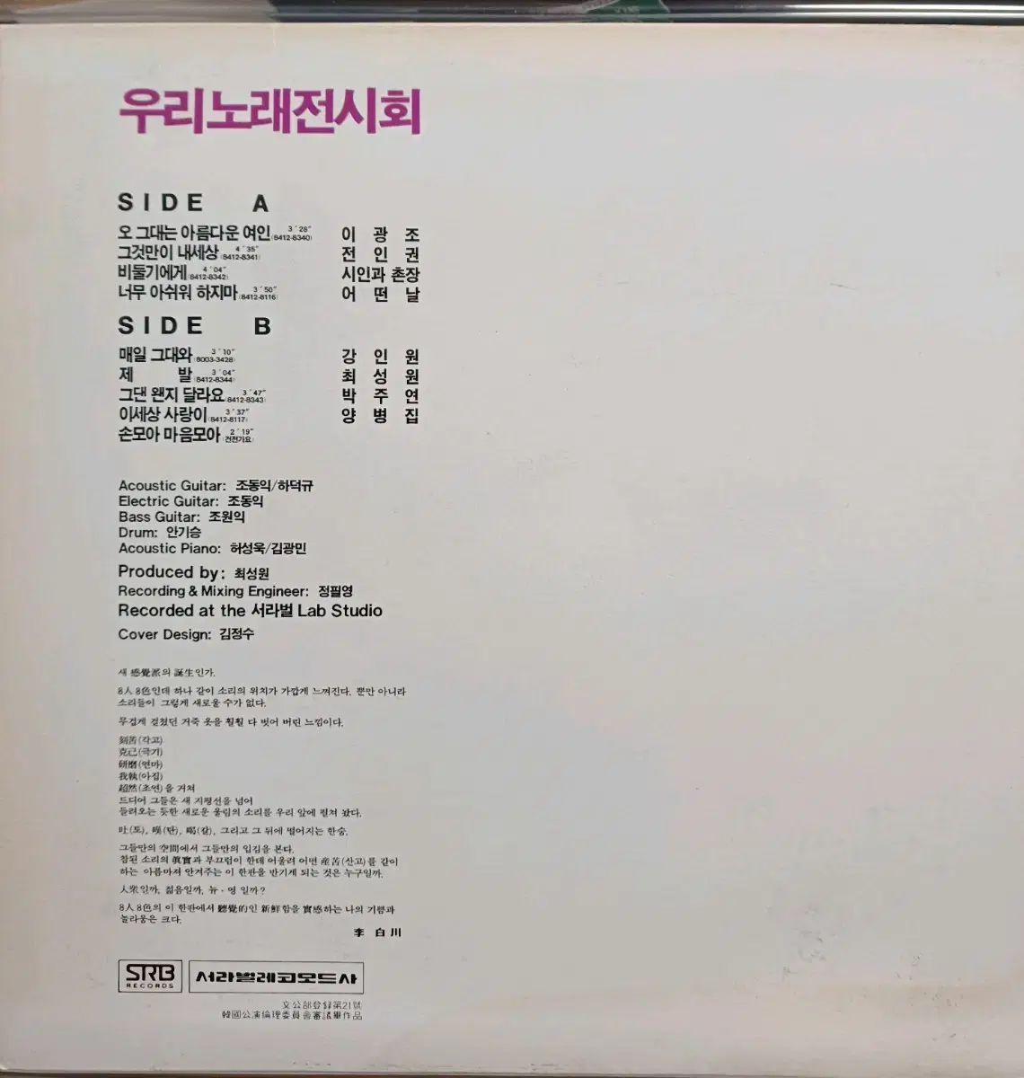 85年初頭に発売されたウリノレ展示会LPです。8人編成のオムニバスアルバムで、ジャケット状態は良いです。イ・グァンジョ、チョン・イングォン、チェ・ソンウォンなど有名歌手の歌が収録されています。別途コメントなければ、すぐに安全決済をお願いいたします!