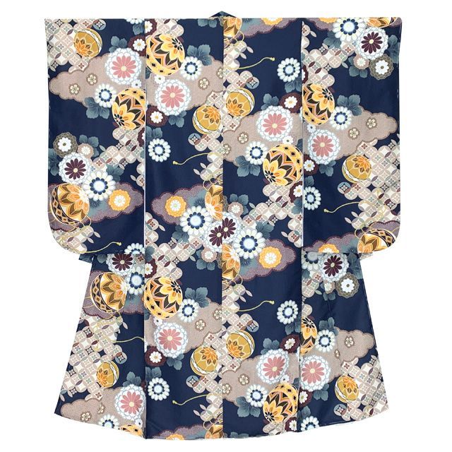 七五三 着物 女の子 セット 総柄の女の子用 子供着物 結び帯コーデセット 合繊 紺地 雲どりに鞠 菊 T 7 K 2550 d 105 MM