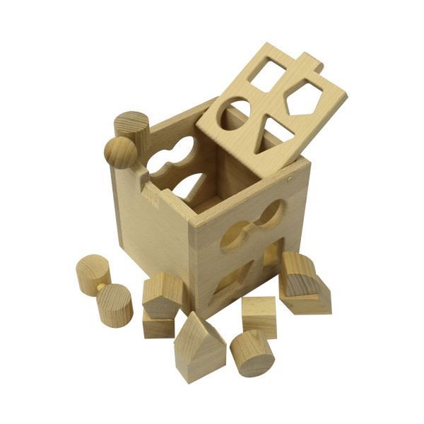 箱の3面には円形や三角形などの形をした穴が開いています。その穴に付属のブロックを入れます。それぞれの穴には決まったブロックしか入りません、形の認識機能を高めます。