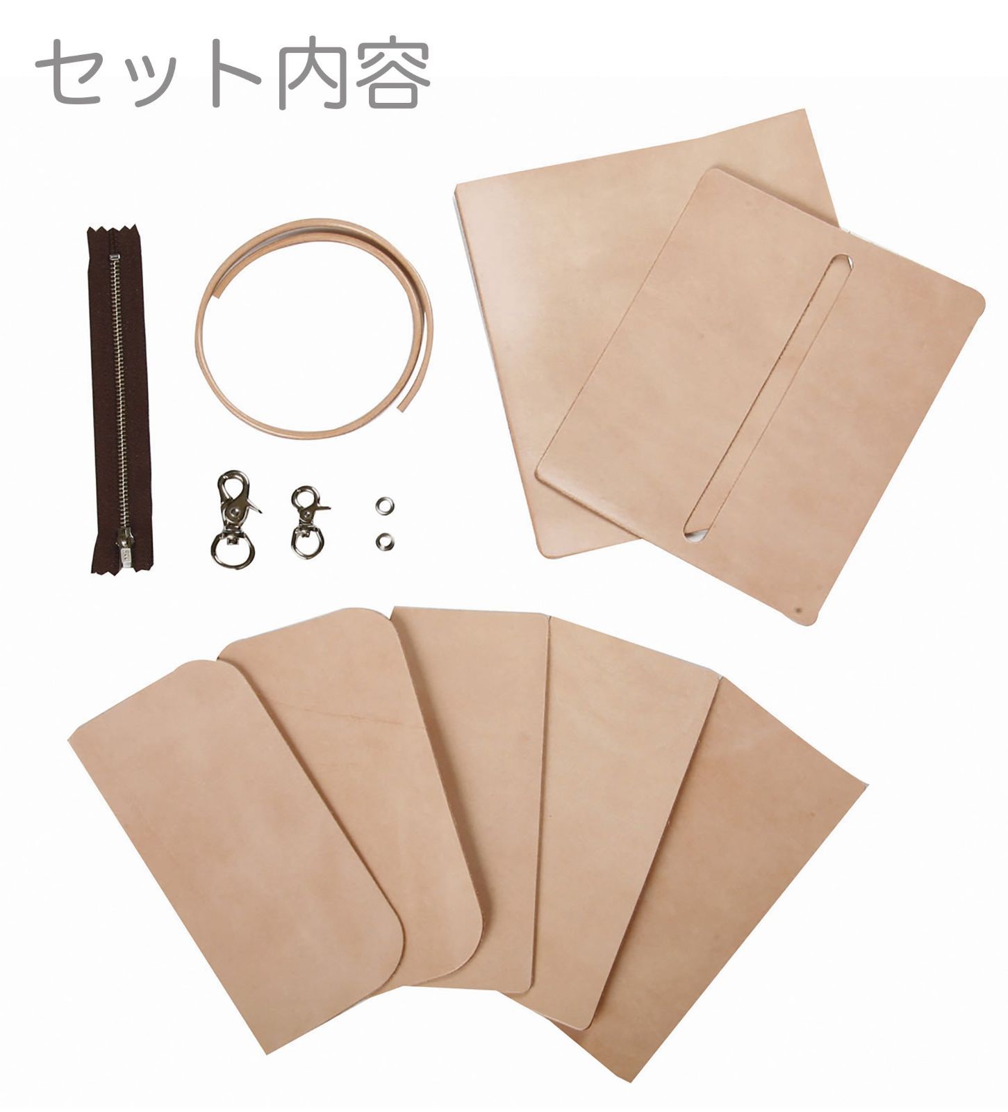 セット内容:サドルレザー(カット済)、ファスナー、丸牛レース(4mm)、ナスカン(大小)、ハトメリング、手縫いガイドブック、製作説明書