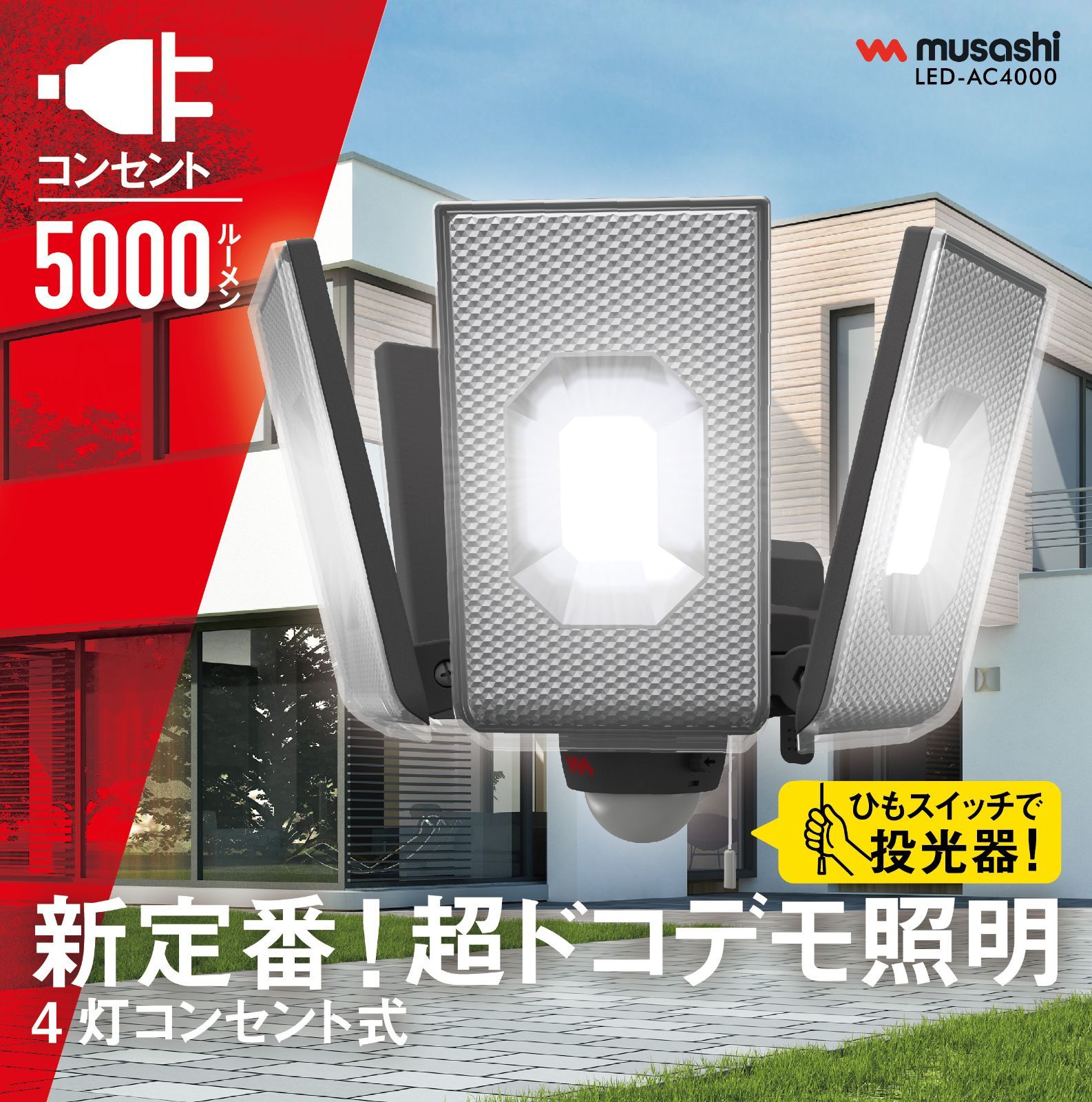 スライド型LEDセンサーライト コンセント式 屋外 防水 防犯 人感センサー 調光 調色 機能 12.5W×4灯 常夜灯 投光器 フラッシュ発光 高輝度 5000ルーメン スマート LED-AC4000 ムサシ MUSASHI 【 送料無料 】