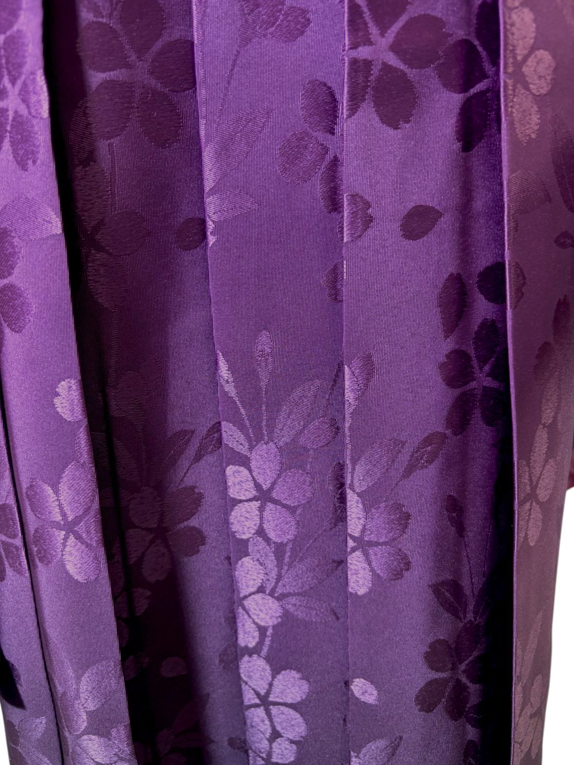 桜の地紋とぼかし染めが入った紫の袴に、牡丹や菊などの大柄な複合花柄が豪華な着物を合わせた、シックかつ華やかなスタイル。