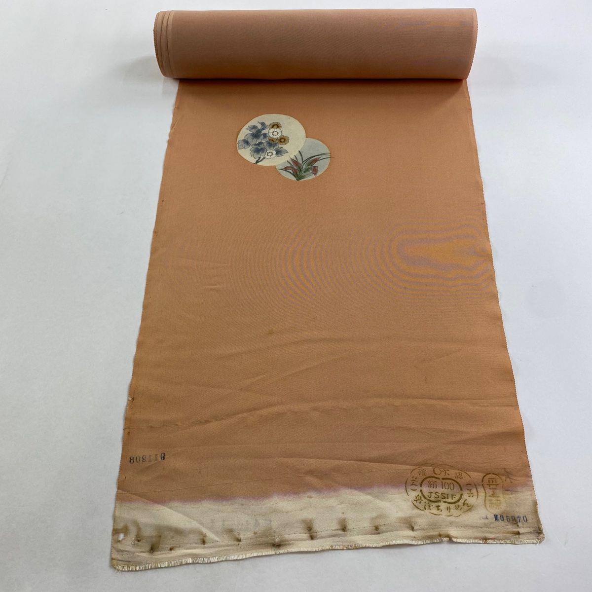 反物 秀品 小紋 丸文 草花 縮緬 薄オレンジ 正絹