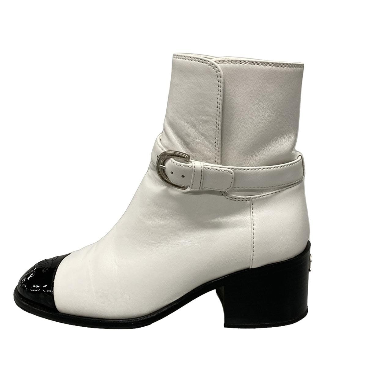 CHANEL シャネル ショートブーツ 37 C レディース - G 38067 Y 56105 K 4778 白×黒 シルバー金具 ラムスキン