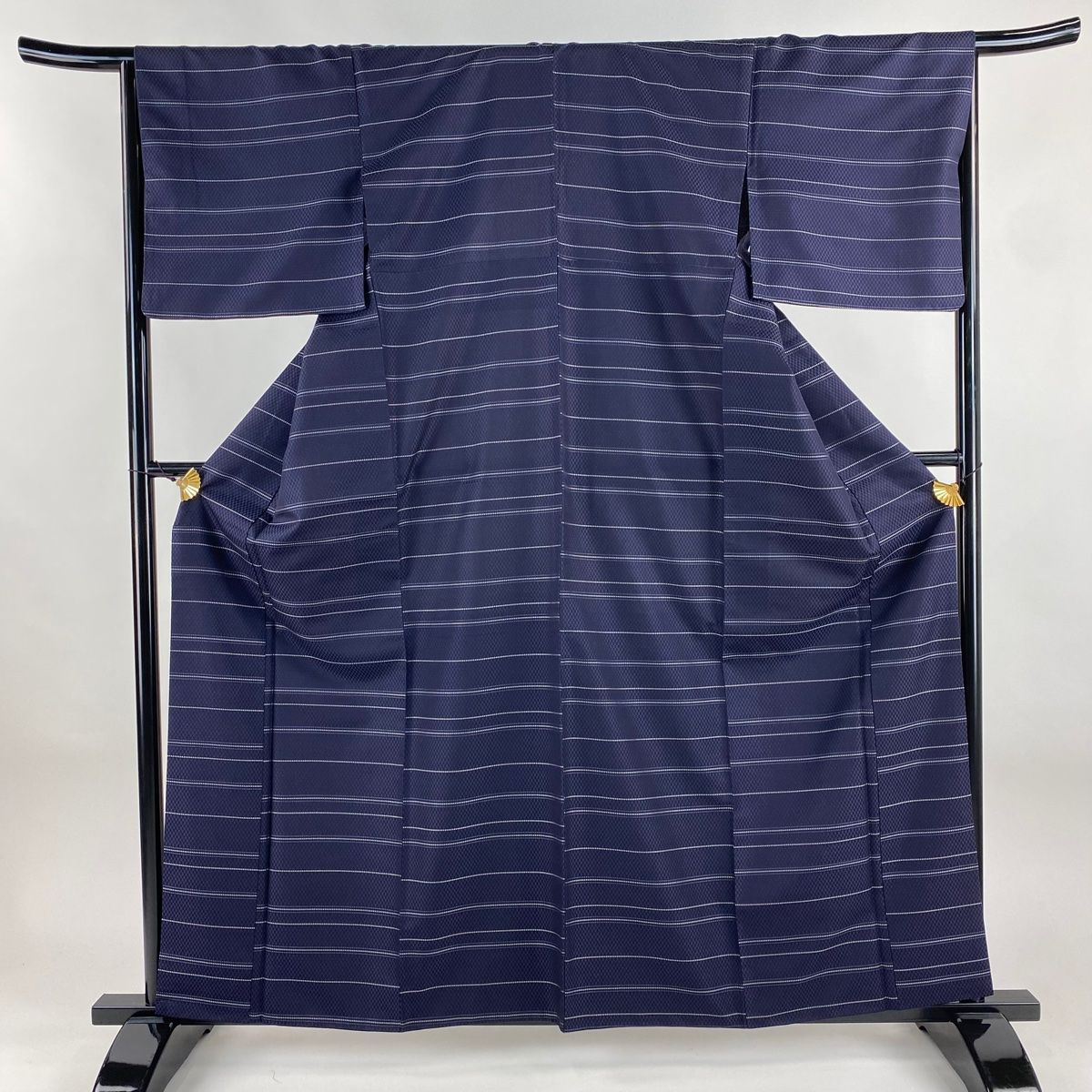 お召 身丈162 cm 裄丈64.5 M 袷 衣宝山 やまと 背抜き 落款 証紙 縞 市松 紺色 正絹