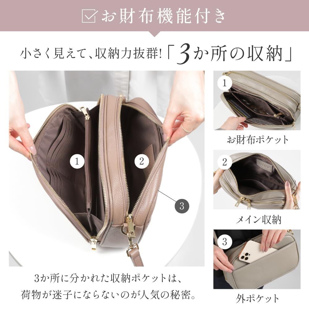 「大人にふさわしい牛本革」専門機関で「牛革証明済」高級感がある、上質な牛革を厳選して使用しました。傷や汚れが目立ちにくく、耐久性にも優れているので長く愛用いただけます。 【サイズ】 「お財布機能付き」 縦:約14.5cm 横:約25cm 奥行:約8cm 「お財布機能なし」 縦:約14.5cm 横:約25cm 奥行:約7cm 「ロングショルダーベルト」約118~127cm 「ショートショルダーベルト」 約84~130cm 【素材】 牛本革 ファスナーカラー:ゴールド