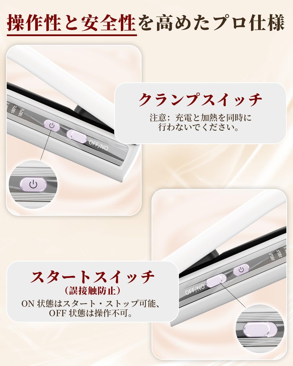 【30秒で立ち上がり・ コードレスヘアアイロン】Panovol ヘアアイロン コードレスはお忙しい朝やお出かけ先でも、スイッチを入れてわずか30秒でご利用いただけます。他社製品を上回る速さで温まるため、急な外出時でも素早くスタイリングが可能です。コードレス設計で、ケーブルの煩わしさがなく、いつでもどこでも自由に美しい髪をお約束します。★注:本製品は機内持ち込み不可です。