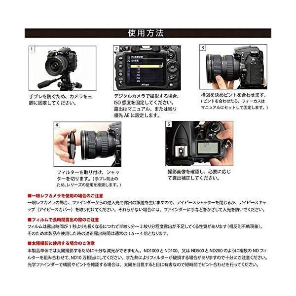 | 商品紹介|Kenko PRO NDフィルターは真空蒸着技術による、特殊な多層膜を施した高精度減光フィルターシリーズです。写真の色彩に影響を与えずに、光量のみを調整したいときに使用します。ND200は光量を1/500(透過率0.2パーセント)で、9絞り分の光量を調整します。|ND500のような高濃度のNDフィルターを使用することで極端なスローシャッターが可能になり、意図的にmotion blur(モーションブラ― )の効果を加えることができます。|渓流の水の流れをシルクのように柔らかくしたり、動きのある被写体のスピード感や動感を効果的に表現することができます。また、動画撮影では、晴天時に絞りを開けて背景をぼかすことが可能です。| 長時間露光により、動く被写体に意図的にブレを生じさせること|受賞|デジタルカメラグランプリ2020 SUMMER 周辺機器部門 金賞|安全警告|本製品単体では太陽撮影する為に十分な減光ができません。複数組み合わせて(10万相当)ご使用下さい。|ブランド紹介|柔らかな描写に、ソフトフィルター|光の量を減らす、NDフィルター|風景を鮮やかに、PLフィルター|光にアクセントを、クロススクリーン|もっと近づいて撮れる、クローズアップレンズ|色彩強調フィルター|株式会社ケンコー・トキナーは、東京都中野区に本社を置く、写真・映像用品、光学製品を製造・販売している会社です。|ケンコー・トキナーはまもなく創立65周年を迎えます。|