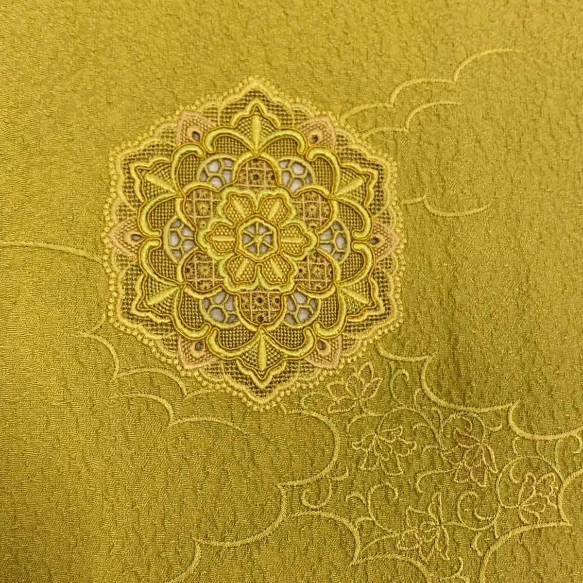 付下げ 身丈155 cm 裄丈63 S 袷 華文 雲文 刺繍 からし色 正絹 秀品 一つ紋