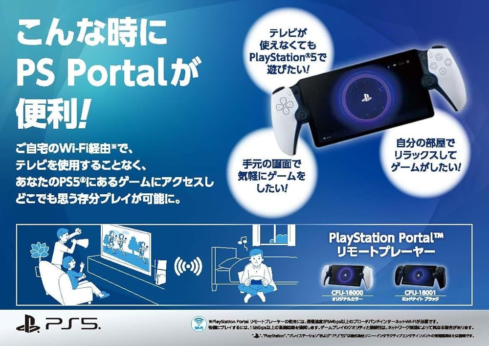 PlayStation 5のゲームをあなたの手のなかで。 PlayStation Portal リモートプレーヤーは、PS5 のゲーム体験を手元で実現するリモートプレイ専用のデバイスです。 アダプティブトリガーやハプティックフィードバックなどのDualSense ワイヤレスコントローラーの主要な機能を備え、8インチ・解像度1080p・60fpsでの描画に対応した液晶ディスプレイは、世界中のゲームクリエイターが生み出す素晴らしいゲームの数々を美麗なグラフィックでお楽しみいただけます。 PlayStation PortalがPS5 本体にWi-Fi経由で接続することで、PS5 からゲームプレイをそのまま引き継いでPlayStation Portalでお楽しみいただけます。 ※PlayStation Portal リモートプレーヤーでゲームをプレイするためにはPS5本体と、Wi-Fi接続で最低5Mbps のブロードバンドインターネット接続環境が必要です。よりよいプレイ体験のためには15Mbps 以上の高速な接続環境を推奨します。 ※ハプティックフィードバックとアダプティブトリガーは、対応しているゲームにおいてのみ使用できます。 ※ VRヘッドセット(PlayStation VRもしくはPS VR2)を必要とするゲーム、および追加の周辺機器(ワイヤレスコントローラー(DUALSHOCK 4)、DualSense ワイヤレスコントローラー、 DualSense Edge ワイヤレスコントローラーを除く)を必要とするゲームは対応しておりません。