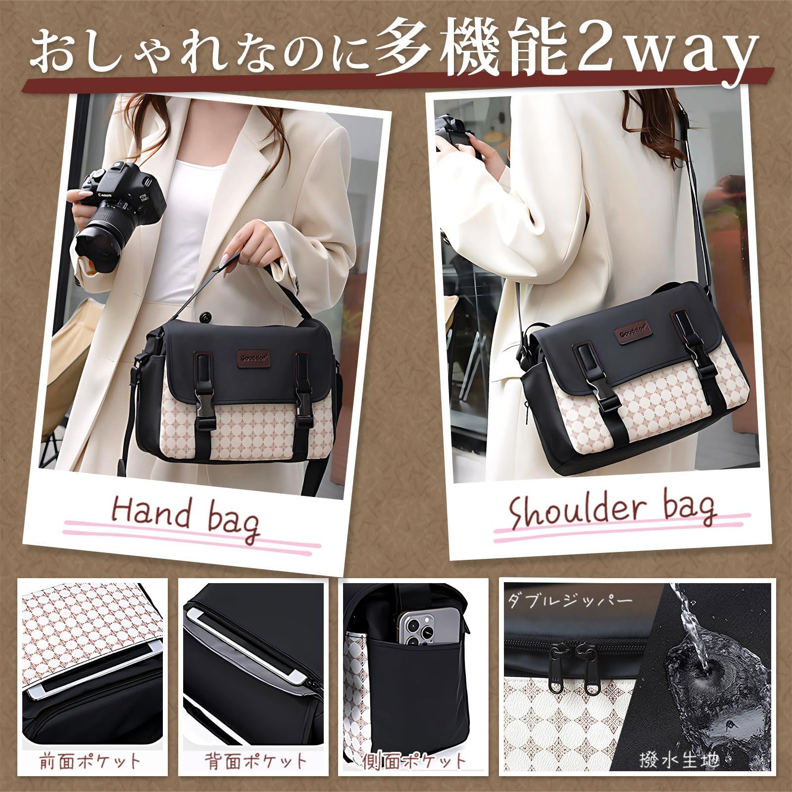 【多機能2WAYデザイン】取り外し可能な仕切り板2枚と前面・背面・側面ポケットで機材とアクセサリーを自在に整理。防水オックスフォード生地が突然の雨からカメラを守ります。手提げとショルダーの2way仕様で、カフェ巡りから本格撮影まで幅広いシーンに対応。おしゃれと機能性を両立した、毎日使いたくなるカメラバッグです。