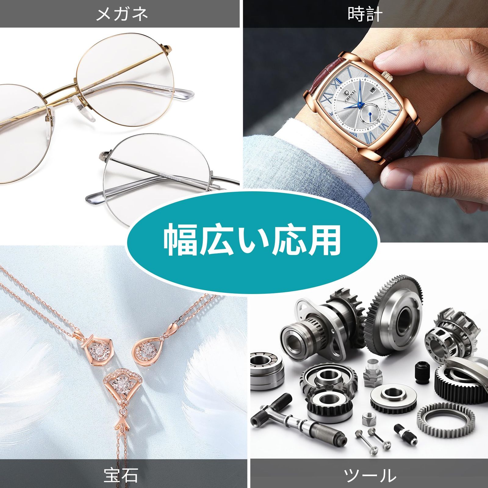 「幅広く応用」超音波洗浄機の内槽サイズは15x13.5x10cmで、主にメガネ、時計部品、ジュエリー、アクセサリーなど様々な業界の洗浄に適しています。本商品は日本語取扱説明書も付いています。何か質問がございましたら、お早めにこちらにご連絡ください。