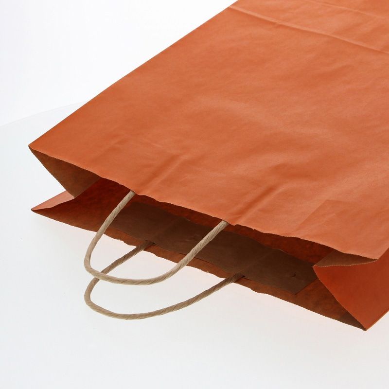 クラフト紙にオレンジベタを印刷した手提げ紙袋です。色落ちを緩和させるために、上からニスを塗布しています。縦長のスタンダードサイズ。