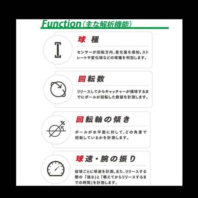 ・スマートフォンとBluetoothペアリングの上、ボール本体を投げると投球データがスマートフォンに転送され、「球速、回転数、回転軸、球種、変化量、腕の振りの強さ」を計測し、専用アプリで投球テータの解析が可能です。(※3軸加速度センサー、3軸地磁気センサー、3軸角速度センサー)