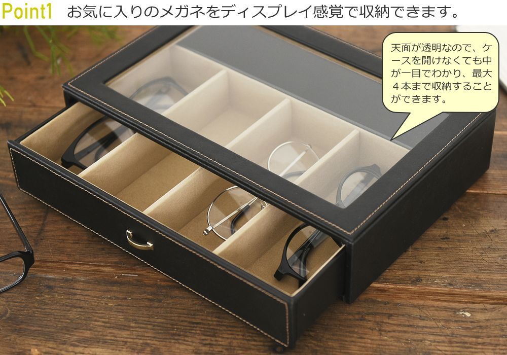 メガネケース 4本 収納 保管 引き出し ケース ボックス 仕切り 眼鏡 サングラス 老眼鏡 メガネ収納ケース 合成皮革 PU インテリア W 29.5×D 20×H 7 cm