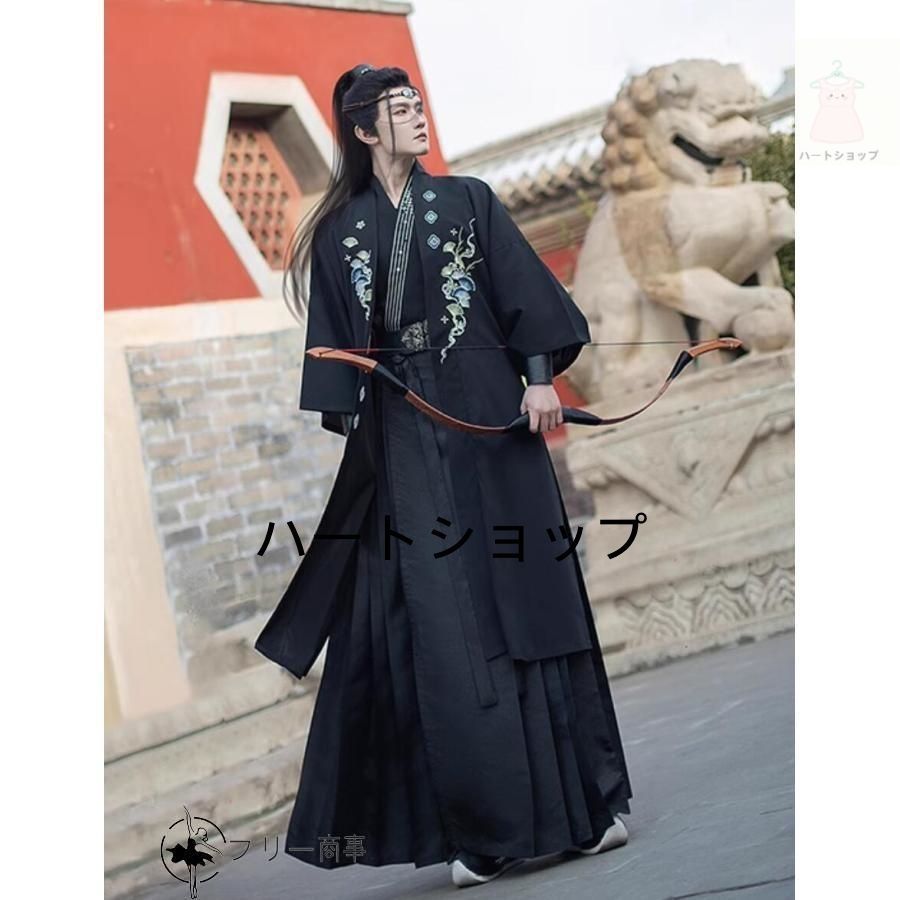 メンズ 漢服 中華コスプレ衣装 6点セット 黒 暗黒系 おしゃれ 交差襟 中国古代服 チャイナ服 エスニック刺しゅう ロング丈羽織カバー付き