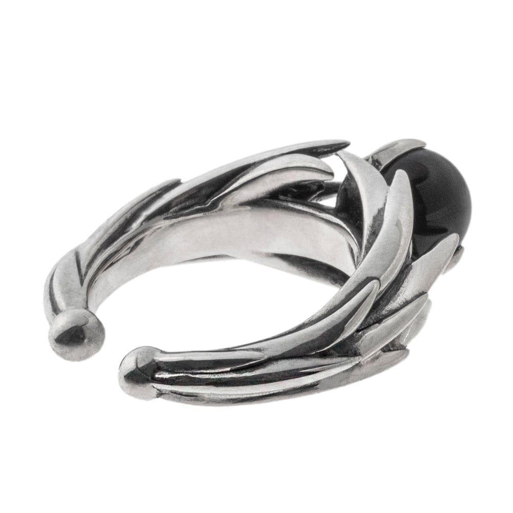 A modern ear cuff with kinetic lines that sweep around the ear. At its core sits a smooth black onyx sphere, embraced by sharp, flowing ridges. The interplay of polished sterling and subtle antiquing heightens the depth and sculptural form.
