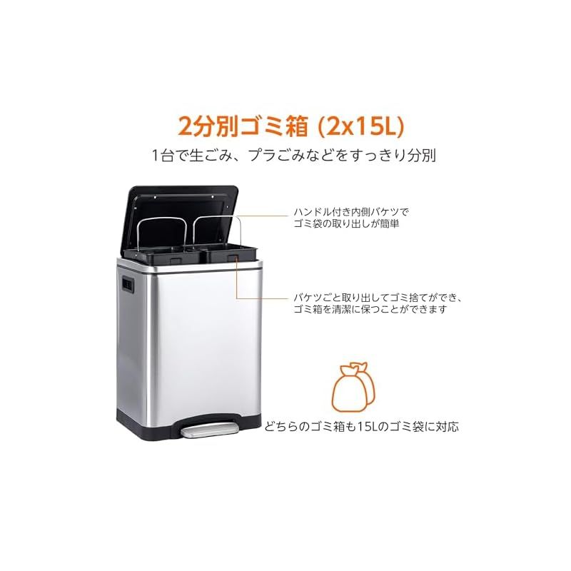 商品名:ベーシック ゴミ箱 2分別 2×15L(15リットル) ソフトクローズ 静音 分別 内側バケツ2個 ふた付き ペダル付き スチール製 つや消しステンレス おしゃれ 長方形