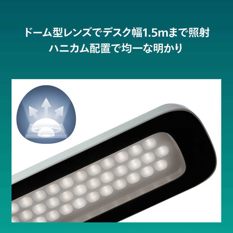 また、ドーム型レンズによりコンパクトな光源でありながら、均一に光を拡散させることでデスクスペース幅1.5mまで明るくします。